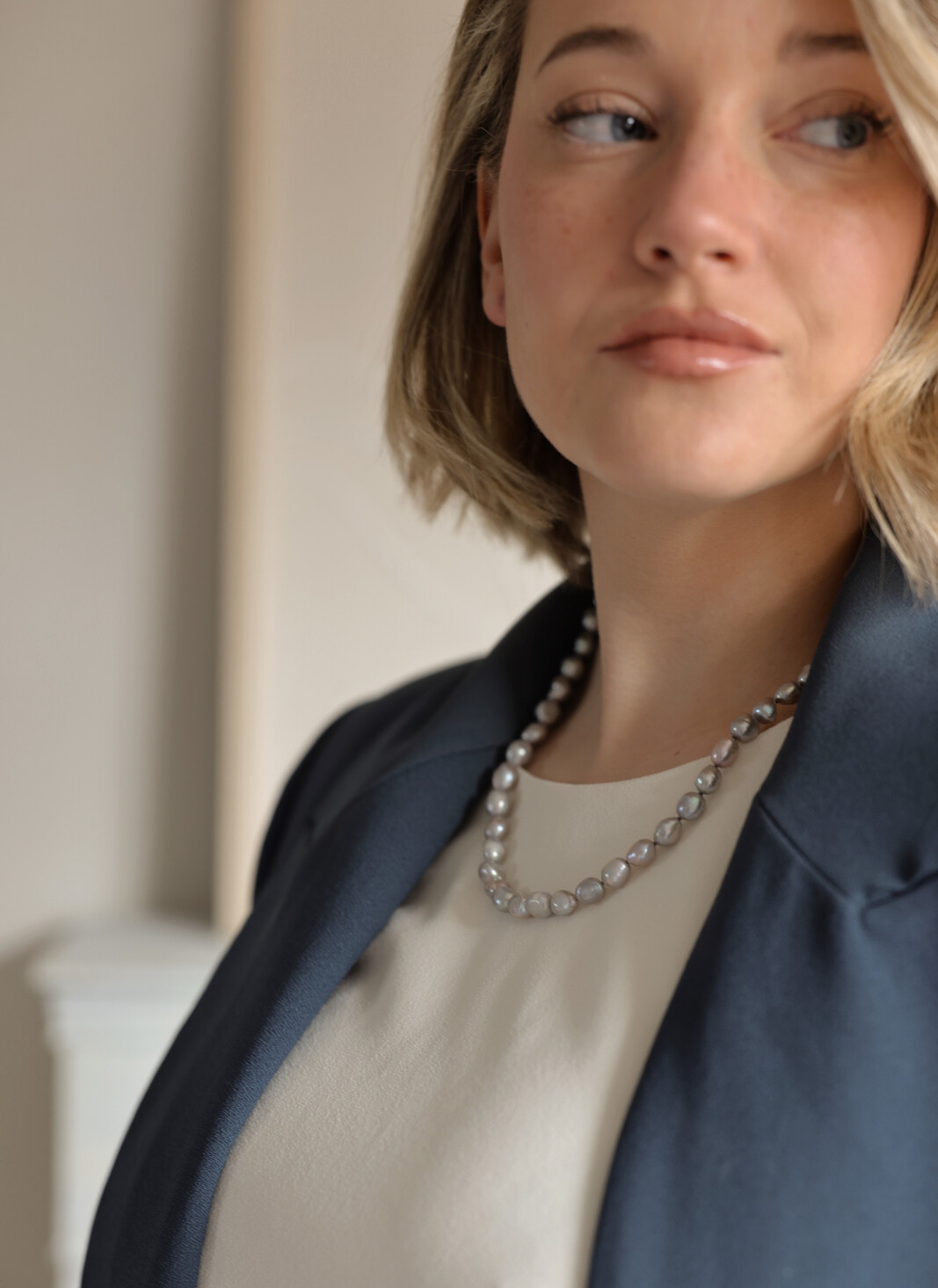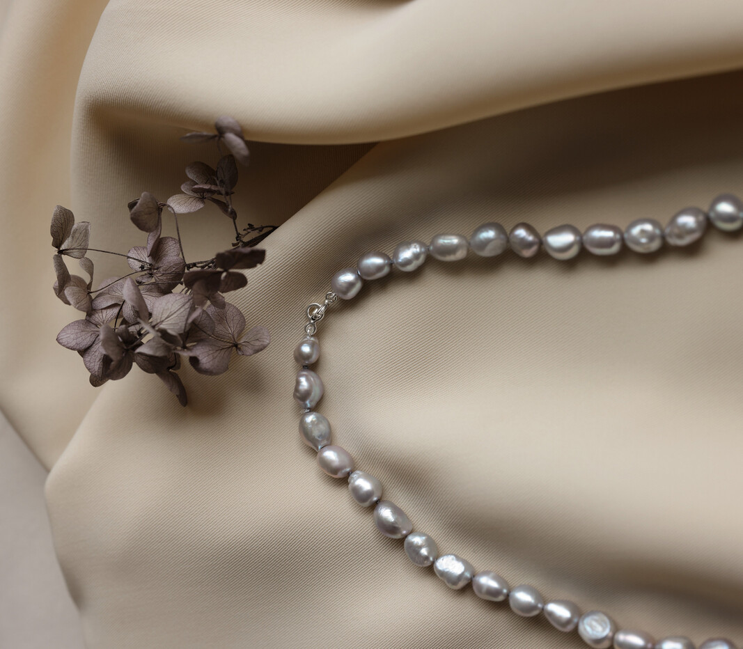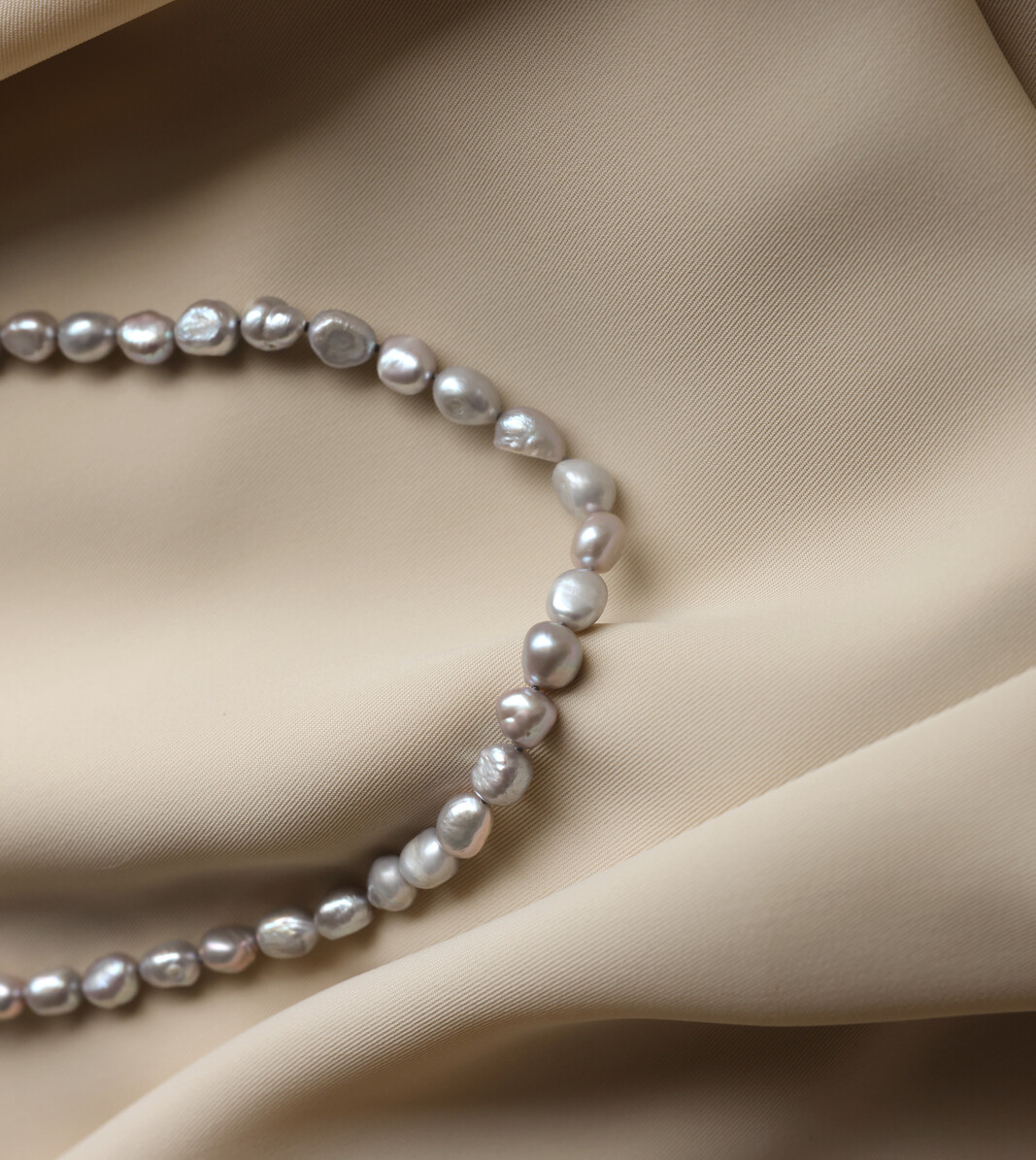 Elaborado con perlas cultivadas de origen asiático en un suave tono gris