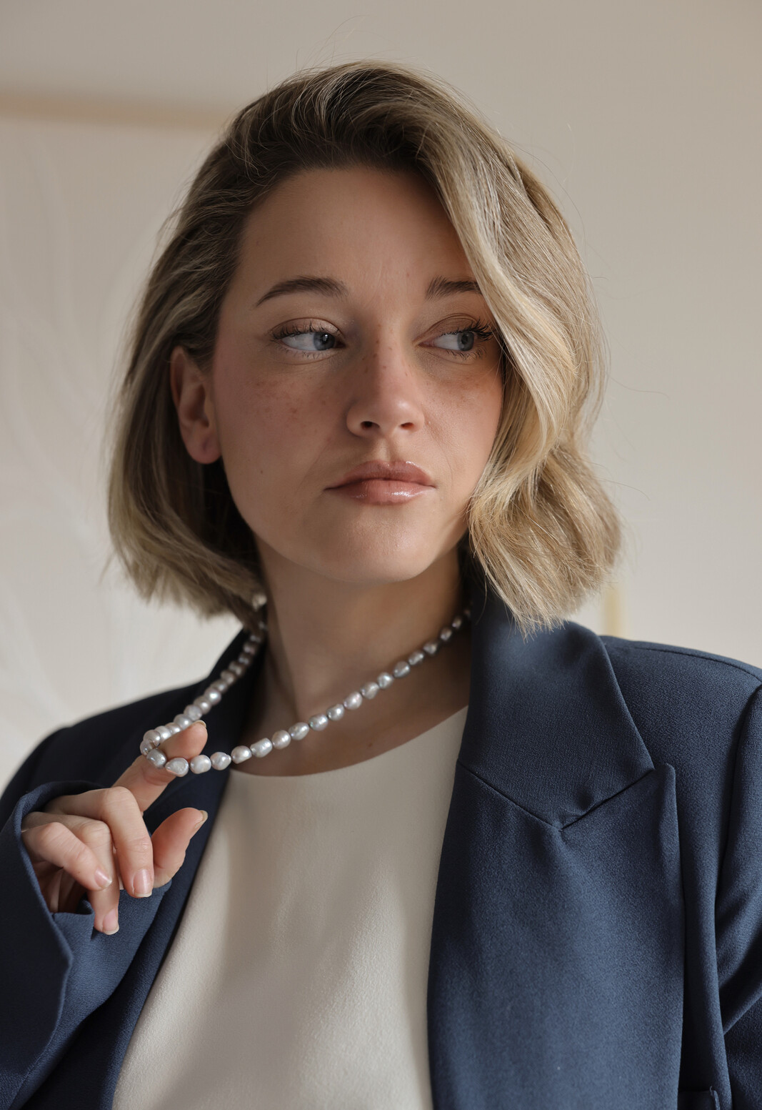 perlas de tamaño medio crean una silueta delicada y luminosa que se adapta con naturalidad tanto a looks cotidianos como a ocasiones especiales. Una pieza versátil y atemporal que aporta un toque de elegancia discreta.