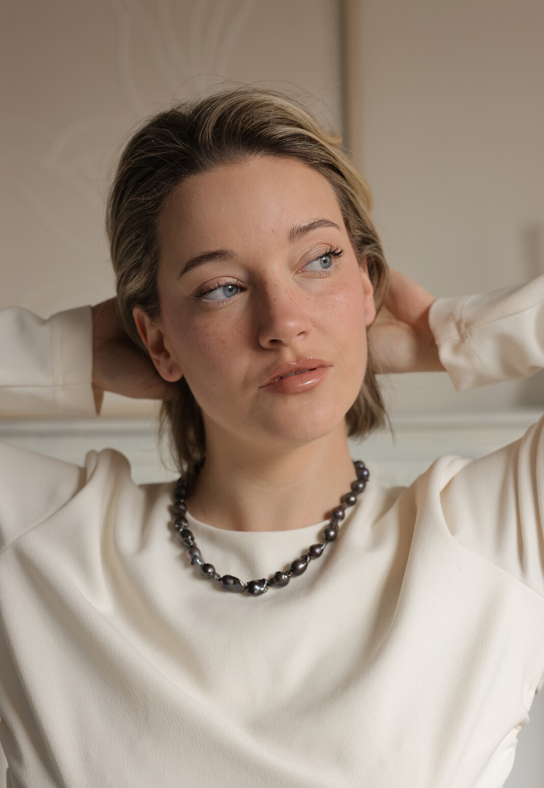 Elaborado con grandes perlas barrocas cultivadas de origen asiático en tono peacock, este collar revela reflejos profundos en matices verdes, violetas y azulados que cambian con la luz. La forma orgánica de cada perla crea una silueta única y contemporánea, convirtiéndolo en una pieza con gran presencia que aporta sofisticación y personalidad tanto en looks minimalistas como en combinaciones más audaces.